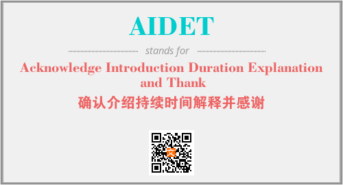 上述内容是“Acknowledge Introduction Duration Explanation and Thank”作为“AIDET”的缩写,解释为“确认介绍持续时间解释并感谢”时的信息,以及英文缩略词AIDET所代表的英文单词,其对应的中文拼音、详细解释以及在英文中的流行度和相关分类、应用领域及应用示例等。