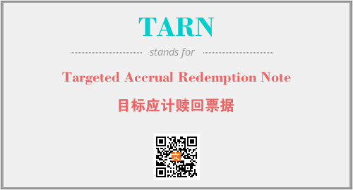 上述内容是“Targeted Accrual Redemption Note”作为“TARN”的缩写,解释为“目标应计赎回票据”时的信息,以及英文缩略词TARN所代表的英文单词,其对应的中文拼音、详细解释以及在英文中的流行度和相关分类、应用领域及应用示例等。