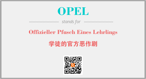 上述内容是“Offizieller Pfusch Eines Lehrlings”作为“OPEL”的缩写,解释为“学徒的官方恶作剧”时的信息,以及英文缩略词OPEL所代表的英文单词,其对应的中文拼音、详细解释以及在英文中的流行度和相关分类、应用领域及应用示例等。