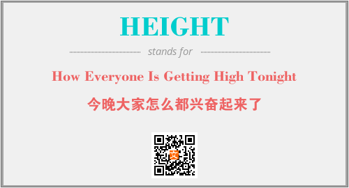 上述内容是“How Everyone Is Getting High Tonight”作为“HEIGHT”的缩写,解释为“今晚大家怎么都兴奋起来了”时的信息,以及英文缩略词HEIGHT所代表的英文单词,其对应的中文拼音、详细解释以及在英文中的流行度和相关分类、应用领域及应用示例等。