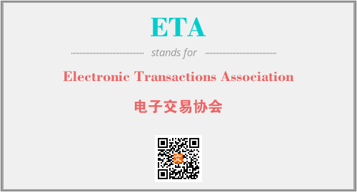 英文缩略词“ETA”经常作为“Electronic Transactions Association”的英文缩写来使用,中文表示:“电子交易协会”。本文将详细介绍英文缩写词ETA所代表英文单词,其对应的中文拼音、详细解释以及在英语中的流行度。此外,还有关于缩略词ETA的分类、应用领域及相关应用示例等。