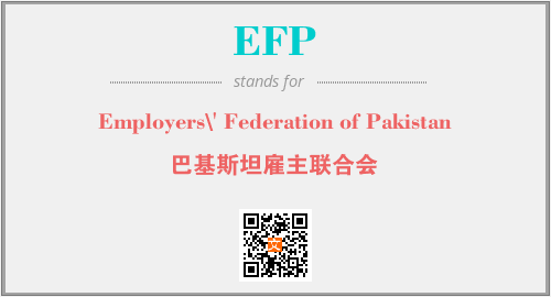英文缩略词“EFP”经常作为“Employers\' Federation of Pakistan”的英文缩写来使用,中文表示:“巴基斯坦雇主联合会”。本文将详细介绍英文缩写词EFP所代表英文单词,其对应的中文拼音、详细解释以及在英语中的流行度。此外,还有关于缩略词EFP的分类、应用领域及相关应用示例等。