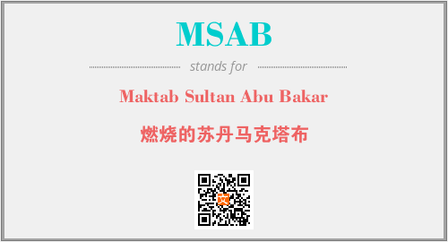 上述内容是“Maktab Sultan Abu Bakar”作为“MSAB”的缩写,解释为“燃烧的苏丹马克塔布”时的信息,以及英文缩略词MSAB所代表的英文单词,其对应的中文拼音、详细解释以及在英文中的流行度和相关分类、应用领域及应用示例等。