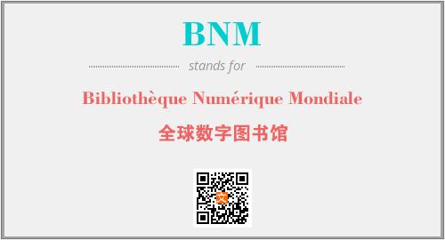 上述内容是“Bibliothèque Numérique Mondiale”作为“BNM”的缩写,解释为“全球数字图书馆”时的信息,以及英文缩略词BNM所代表的英文单词,其对应的中文拼音、详细解释以及在英文中的流行度和相关分类、应用领域及应用示例等。