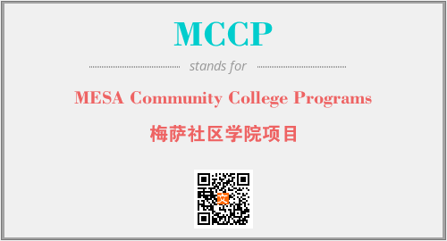 英文缩略词“MCCP”经常作为“MESA Community College Programs”的英文缩写来使用,中文表示:“梅萨社区学院项目”。本文将详细介绍英文缩写词MCCP所代表英文单词,其对应的中文拼音、详细解释以及在英语中的流行度。此外,还有关于缩略词MCCP的分类、应用领域及相关应用示例等。
