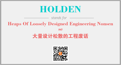 上述内容是“Heaps Of Loosely Designed Engineering Nonsense”作为“HOLDEN”的缩写,解释为“大量设计松散的工程废话”时的信息,以及英文缩略词HOLDEN所代表的英文单词,其对应的中文拼音、详细解释以及在英文中的流行度和相关分类、应用领域及应用示例等。