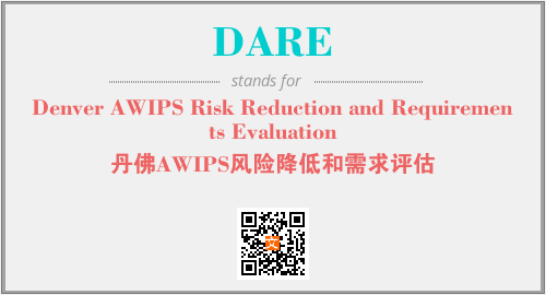 上述内容是“Denver AWIPS Risk Reduction and Requirements Evaluation”作为“DARE”的缩写,解释为“丹佛AWIPS风险降低和需求评估”时的信息,以及英文缩略词DARE所代表的英文单词,其对应的中文拼音、详细解释以及在英文中的流行度和相关分类、应用领域及应用示例等。
