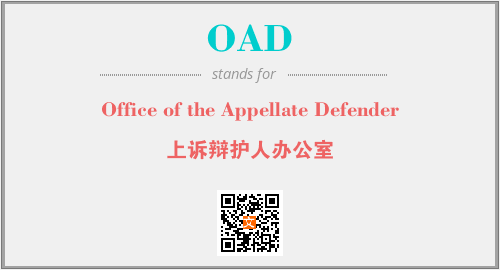 上述内容是“Office of the Appellate Defender”作为“OAD”的缩写,解释为“上诉辩护人办公室”时的信息,以及英文缩略词OAD所代表的英文单词,其对应的中文拼音、详细解释以及在英文中的流行度和相关分类、应用领域及应用示例等。