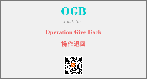 上述内容是“Operation Give Back”作为“OGB”的缩写,解释为“操作退回”时的信息,以及英文缩略词OGB所代表的英文单词,其对应的中文拼音、详细解释以及在英文中的流行度和相关分类、应用领域及应用示例等。