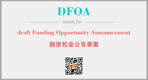 上述内容是“draft Funding Opportunity Announcement”作为“DFOA”的缩写,解释为“融资机会公告草案”时的信息,以及英文缩略词DFOA所代表的英文单词,其对应的中文拼音、详细解释以及在英文中的流行度和相关分类、应用领域及应用示例等。
