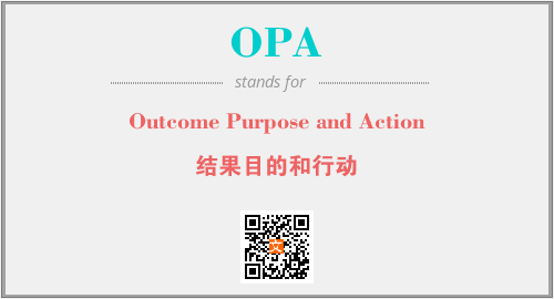 上述内容是“Outcome Purpose and Action”作为“OPA”的缩写,解释为“结果目的和行动”时的信息,以及英文缩略词OPA所代表的英文单词,其对应的中文拼音、详细解释以及在英文中的流行度和相关分类、应用领域及应用示例等。