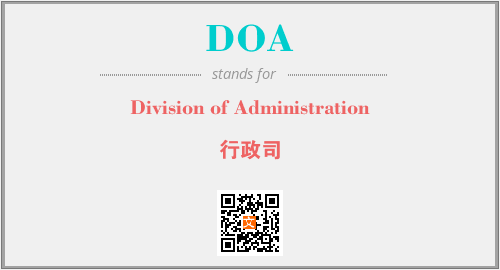 上述内容是“Division of Administration”作为“DOA”的缩写,解释为“行政司”时的信息,以及英文缩略词DOA所代表的英文单词,其对应的中文拼音、详细解释以及在英文中的流行度和相关分类、应用领域及应用示例等。