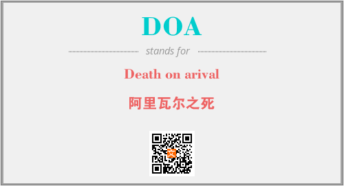 上述内容是“Death on arival”作为“DOA”的缩写,解释为“阿里瓦尔之死”时的信息,以及英文缩略词DOA所代表的英文单词,其对应的中文拼音、详细解释以及在英文中的流行度和相关分类、应用领域及应用示例等。