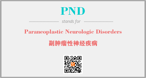 上述内容是“Paraneoplastic Neurologic Disorders”作为“PND”的缩写,解释为“副肿瘤性神经疾病”时的信息,以及英文缩略词PND所代表的英文单词,其对应的中文拼音、详细解释以及在英文中的流行度和相关分类、应用领域及应用示例等。