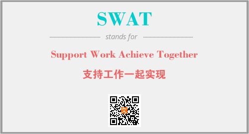 英文缩略词“SWAT”经常作为“Support Work Achieve Together”的英文缩写来使用,中文表示:“支持工作一起实现”。本文将详细介绍英文缩写词SWAT所代表英文单词,其对应的中文拼音、详细解释以及在英语中的流行度。此外,还有关于缩略词SWAT的分类、应用领域及相关应用示例等。