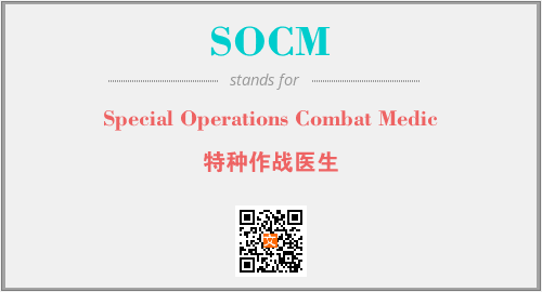 英文缩略词“SOCM”经常作为“Special Operations Combat Medic”的英文缩写来使用,中文表示:“特种作战医生”。本文将详细介绍英文缩写词SOCM所代表英文单词,其对应的中文拼音、详细解释以及在英语中的流行度。此外,还有关于缩略词SOCM的分类、应用领域及相关应用示例等。