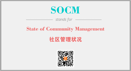 上述内容是“State of Community Management”作为“SOCM”的缩写,解释为“社区管理状况”时的信息,以及英文缩略词SOCM所代表的英文单词,其对应的中文拼音、详细解释以及在英文中的流行度和相关分类、应用领域及应用示例等。