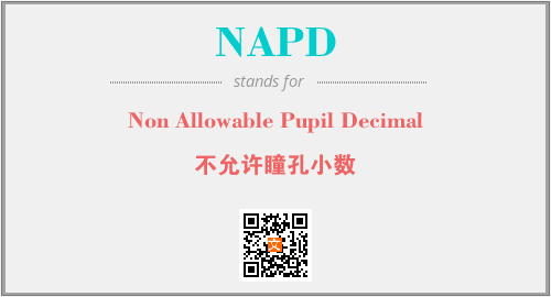 上述内容是“Non Allowable Pupil Decimal”作为“NAPD”的缩写,解释为“不允许瞳孔小数”时的信息,以及英文缩略词NAPD所代表的英文单词,其对应的中文拼音、详细解释以及在英文中的流行度和相关分类、应用领域及应用示例等。