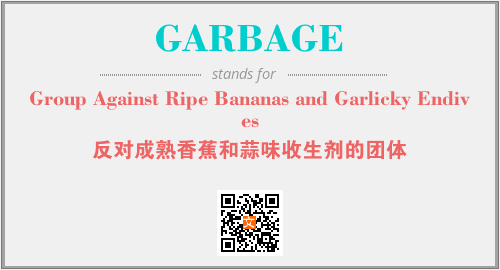 上述内容是“Group Against Ripe Bananas and Garlicky Endives”作为“GARBAGE”的缩写,解释为“反对成熟香蕉和蒜味收生剂的团体”时的信息,以及英文缩略词GARBAGE所代表的英文单词,其对应的中文拼音、详细解释以及在英文中的流行度和相关分类、应用领域及应用示例等。