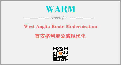 上述内容是“West Anglia Route Modernisation”作为“WARM”的缩写,解释为“西安格利亚公路现代化”时的信息,以及英文缩略词WARM所代表的英文单词,其对应的中文拼音、详细解释以及在英文中的流行度和相关分类、应用领域及应用示例等。