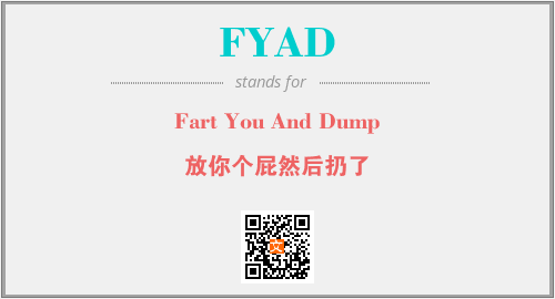 英文缩略词“FYAD”经常作为“Fart You And Dump”的英文缩写来使用,中文表示:“放你个屁然后扔了”。本文将详细介绍英文缩写词FYAD所代表英文单词,其对应的中文拼音、详细解释以及在英语中的流行度。此外,还有关于缩略词FYAD的分类、应用领域及相关应用示例等。