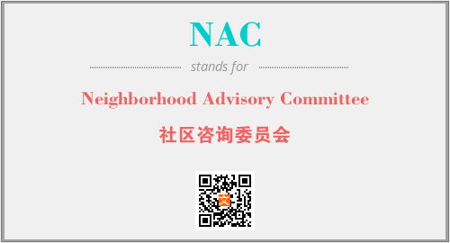 上述内容是“Neighborhood Advisory Committee”作为“NAC”的缩写,解释为“社区咨询委员会”时的信息,以及英文缩略词NAC所代表的英文单词,其对应的中文拼音、详细解释以及在英文中的流行度和相关分类、应用领域及应用示例等。