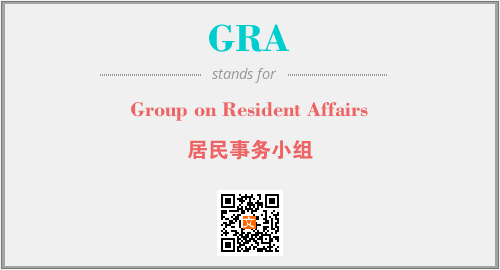 上述内容是“Group on Resident Affairs”作为“GRA”的缩写,解释为“居民事务小组”时的信息,以及英文缩略词GRA所代表的英文单词,其对应的中文拼音、详细解释以及在英文中的流行度和相关分类、应用领域及应用示例等。