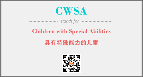 英文缩略词“CWSA”经常作为“Children with Special Abilities”的英文缩写来使用,中文表示:“具有特殊能力的儿童”。本文将详细介绍英文缩写词CWSA所代表英文单词,其对应的中文拼音、详细解释以及在英语中的流行度。此外,还有关于缩略词CWSA的分类、应用领域及相关应用示例等。