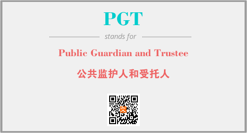 英文缩略词“PGT”经常作为“Public Guardian and Trustee”的英文缩写来使用,中文表示:“公共监护人和受托人”。本文将详细介绍英文缩写词PGT所代表英文单词,其对应的中文拼音、详细解释以及在英语中的流行度。此外,还有关于缩略词PGT的分类、应用领域及相关应用示例等。