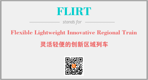 上述内容是“Flexible Lightweight Innovative Regional Train”作为“FLIRT”的缩写,解释为“灵活轻便的创新区域列车”时的信息,以及英文缩略词FLIRT所代表的英文单词,其对应的中文拼音、详细解释以及在英文中的流行度和相关分类、应用领域及应用示例等。
