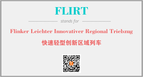 上述内容是“Flinker Leichter Innovativer Regional Triebzug”作为“FLIRT”的缩写,解释为“快速轻型创新区域列车”时的信息,以及英文缩略词FLIRT所代表的英文单词,其对应的中文拼音、详细解释以及在英文中的流行度和相关分类、应用领域及应用示例等。