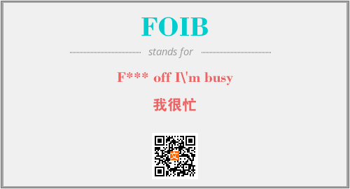 上述内容是“F*** off I\'m busy”作为“FOIB”的缩写,解释为“我很忙”时的信息,以及英文缩略词FOIB所代表的英文单词,其对应的中文拼音、详细解释以及在英文中的流行度和相关分类、应用领域及应用示例等。