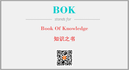 英文缩略词“BOK”经常作为“Book Of Knowledge”的英文缩写来使用,中文表示:“知识之书”。本文将详细介绍英文缩写词BOK所代表英文单词,其对应的中文拼音、详细解释以及在英语中的流行度。此外,还有关于缩略词BOK的分类、应用领域及相关应用示例等。