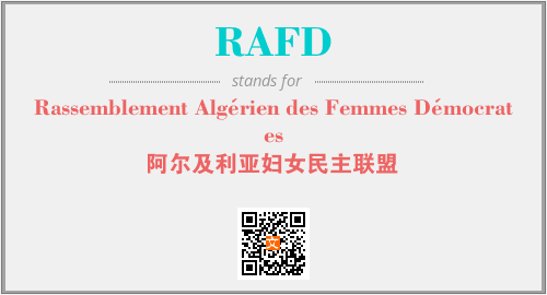 上述内容是“Rassemblement Algérien des Femmes Démocrates”作为“RAFD”的缩写,解释为“阿尔及利亚妇女民主联盟”时的信息,以及英文缩略词RAFD所代表的英文单词,其对应的中文拼音、详细解释以及在英文中的流行度和相关分类、应用领域及应用示例等。