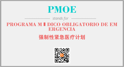 上述内容是“PROGRAMA MÉDICO OBLIGATORIO DE EMERGENCIA”作为“PMOE”的缩写,解释为“强制性紧急医疗计划”时的信息,以及英文缩略词PMOE所代表的英文单词,其对应的中文拼音、详细解释以及在英文中的流行度和相关分类、应用领域及应用示例等。