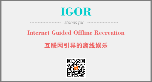 上述内容是“Internet Guided Offline Recreation”作为“IGOR”的缩写,解释为“互联网引导的离线娱乐”时的信息,以及英文缩略词IGOR所代表的英文单词,其对应的中文拼音、详细解释以及在英文中的流行度和相关分类、应用领域及应用示例等。