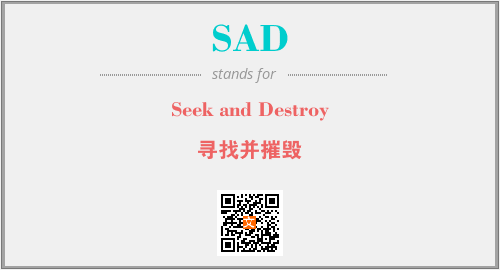 上述内容是“Seek and Destroy”作为“SAD”的缩写,解释为“寻找并摧毁”时的信息,以及英文缩略词SAD所代表的英文单词,其对应的中文拼音、详细解释以及在英文中的流行度和相关分类、应用领域及应用示例等。