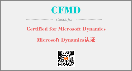 上述内容是“Certified for Microsoft Dynamics”作为“CFMD”的缩写,解释为“Microsoft Dynamics认证”时的信息,以及英文缩略词CFMD所代表的英文单词,其对应的中文拼音、详细解释以及在英文中的流行度和相关分类、应用领域及应用示例等。