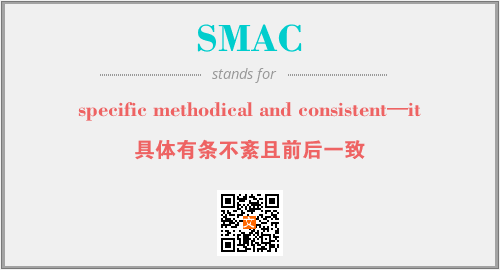 上述内容是“specific methodical and consistent—it”作为“SMAC”的缩写,解释为“具体有条不紊且前后一致”时的信息,以及英文缩略词SMAC所代表的英文单词,其对应的中文拼音、详细解释以及在英文中的流行度和相关分类、应用领域及应用示例等。
