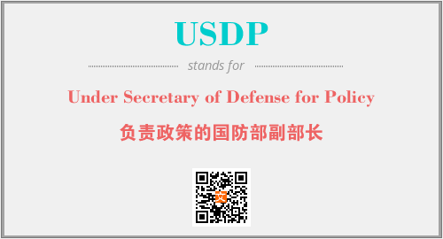 上述内容是“Under Secretary of Defense for Policy”作为“USDP”的缩写,解释为“负责政策的国防部副部长”时的信息,以及英文缩略词USDP所代表的英文单词,其对应的中文拼音、详细解释以及在英文中的流行度和相关分类、应用领域及应用示例等。