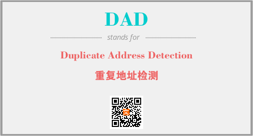 上述内容是“Duplicate Address Detection”作为“DAD”的缩写,解释为“重复地址检测”时的信息,以及英文缩略词DAD所代表的英文单词,其对应的中文拼音、详细解释以及在英文中的流行度和相关分类、应用领域及应用示例等。