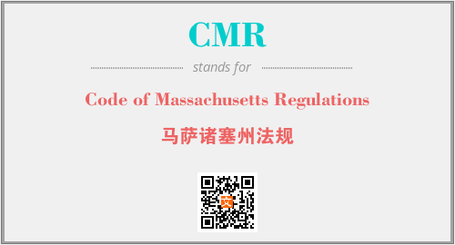 英文缩略词“CMR”经常作为“Code of Massachusetts Regulations”的英文缩写来使用,中文表示:“马萨诸塞州法规”。本文将详细介绍英文缩写词CMR所代表英文单词,其对应的中文拼音、详细解释以及在英语中的流行度。此外,还有关于缩略词CMR的分类、应用领域及相关应用示例等。