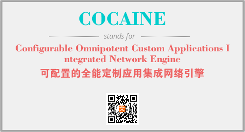 上述内容是“Configurable Omnipotent Custom Applications Integrated Network Engine”作为“COCAINE”的缩写,解释为“可配置的全能定制应用集成网络引擎”时的信息,以及英文缩略词COCAINE所代表的英文单词,其对应的中文拼音、详细解释以及在英文中的流行度和相关分类、应用领域及应用示例等。
