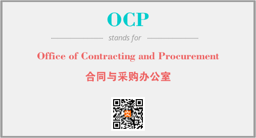 英文缩略词“OCP”经常作为“Office of Contracting and Procurement”的英文缩写来使用,中文表示:“合同与采购办公室”。本文将详细介绍英文缩写词OCP所代表英文单词,其对应的中文拼音、详细解释以及在英语中的流行度。此外,还有关于缩略词OCP的分类、应用领域及相关应用示例等。
