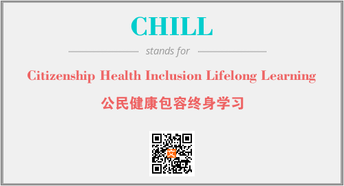 上述内容是“Citizenship Health Inclusion Lifelong Learning”作为“CHILL”的缩写,解释为“公民健康包容终身学习”时的信息,以及英文缩略词CHILL所代表的英文单词,其对应的中文拼音、详细解释以及在英文中的流行度和相关分类、应用领域及应用示例等。
