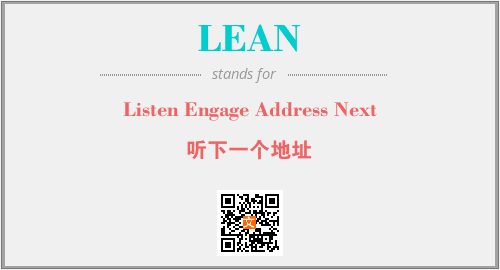 上述内容是“Listen Engage Address Next”作为“LEAN”的缩写,解释为“听下一个地址”时的信息,以及英文缩略词LEAN所代表的英文单词,其对应的中文拼音、详细解释以及在英文中的流行度和相关分类、应用领域及应用示例等。