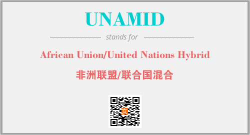 上述内容是“African Union/United Nations Hybrid”作为“UNAMID”的缩写,解释为“非洲联盟/联合国混合”时的信息,以及英文缩略词UNAMID所代表的英文单词,其对应的中文拼音、详细解释以及在英文中的流行度和相关分类、应用领域及应用示例等。