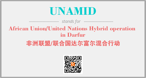 英文缩略词“UNAMID”经常作为“African Union/United Nations Hybrid operation in Darfur”的英文缩写来使用,中文表示:“非洲联盟/联合国达尔富尔混合行动”。本文将详细介绍英文缩写词UNAMID所代表英文单词,其对应的中文拼音、详细解释以及在英语中的流行度。此外,还有关于缩略词UNAMID的分类、应用领域及相关应用示例等。