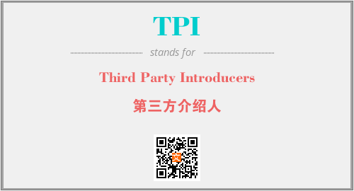 英文缩略词“TPI”经常作为“Third Party Introducers”的英文缩写来使用,中文表示:“第三方介绍人”。本文将详细介绍英文缩写词TPI所代表英文单词,其对应的中文拼音、详细解释以及在英语中的流行度。此外,还有关于缩略词TPI的分类、应用领域及相关应用示例等。