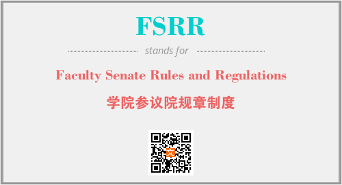 英文缩略词“FSRR”经常作为“Faculty Senate Rules and Regulations”的英文缩写来使用,中文表示:“学院参议院规章制度”。本文将详细介绍英文缩写词FSRR所代表英文单词,其对应的中文拼音、详细解释以及在英语中的流行度。此外,还有关于缩略词FSRR的分类、应用领域及相关应用示例等。